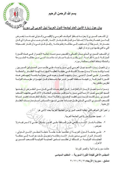 إن الشعب السوري إذ يحزنه تباطؤ الموقف العربي والإقليمي والدولي تجاه ما يتعرض إليه من هجمة وحشية لا إنسانية من قبل نظام بشار الأسد , فإنه يرحب بأي مبادرة أي كان مصدرها , شريطة أن تستجيب إلى مطالبه وطموحاته , وقبل كل شيء أن تقدر تضحياته التي ما فتئ يقدمها دون تردد أو تقهقر.