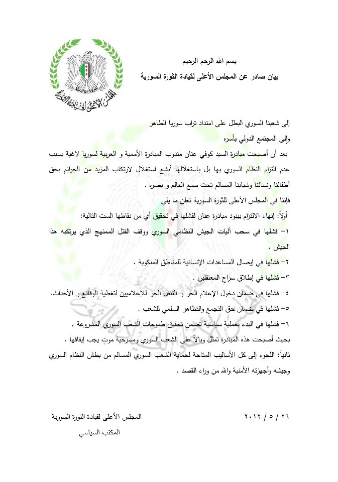 أولاً: إنهاء الالتزام ببنود مبادرة عنان لفشلها في تحقيق أي من نقاطها الست التالية: