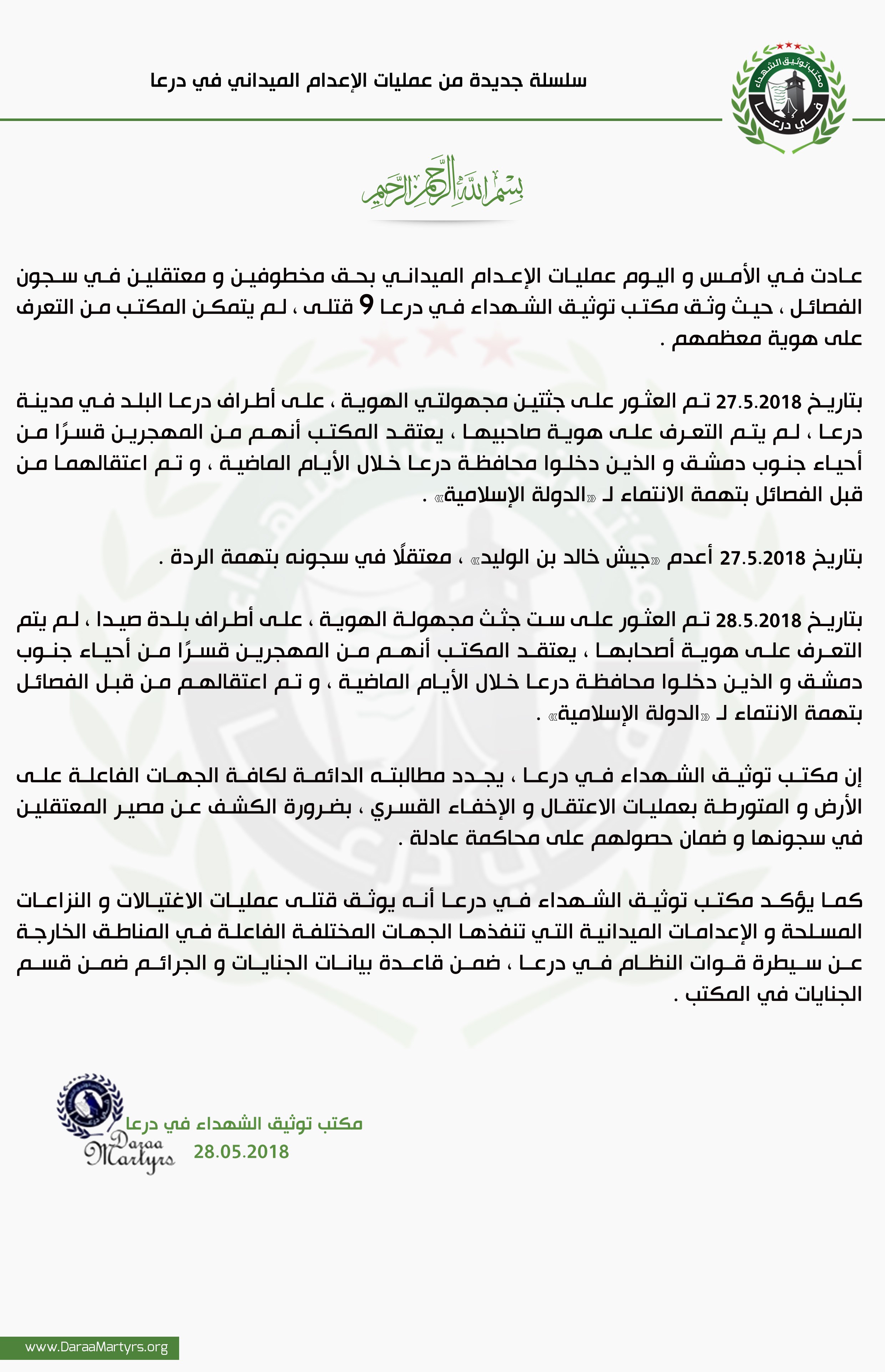 بتاريخ 27.5.2018 تم العثور على جثتين مجهولتي الهوية ، على أطراف درعا البلد في مدينة درعا ، لم يتم التعرف على هوية صاحبيها ، يعتقد المكتب أنهم من المهجرين قسرًا من أحياء جنوب دمشق و الذين دخلوا محافظة درعا خلال الأيام الماضية ، و تم اعتقالهما من قبل الفصائل بتهمة الانتماء للدولة الإسلامية .