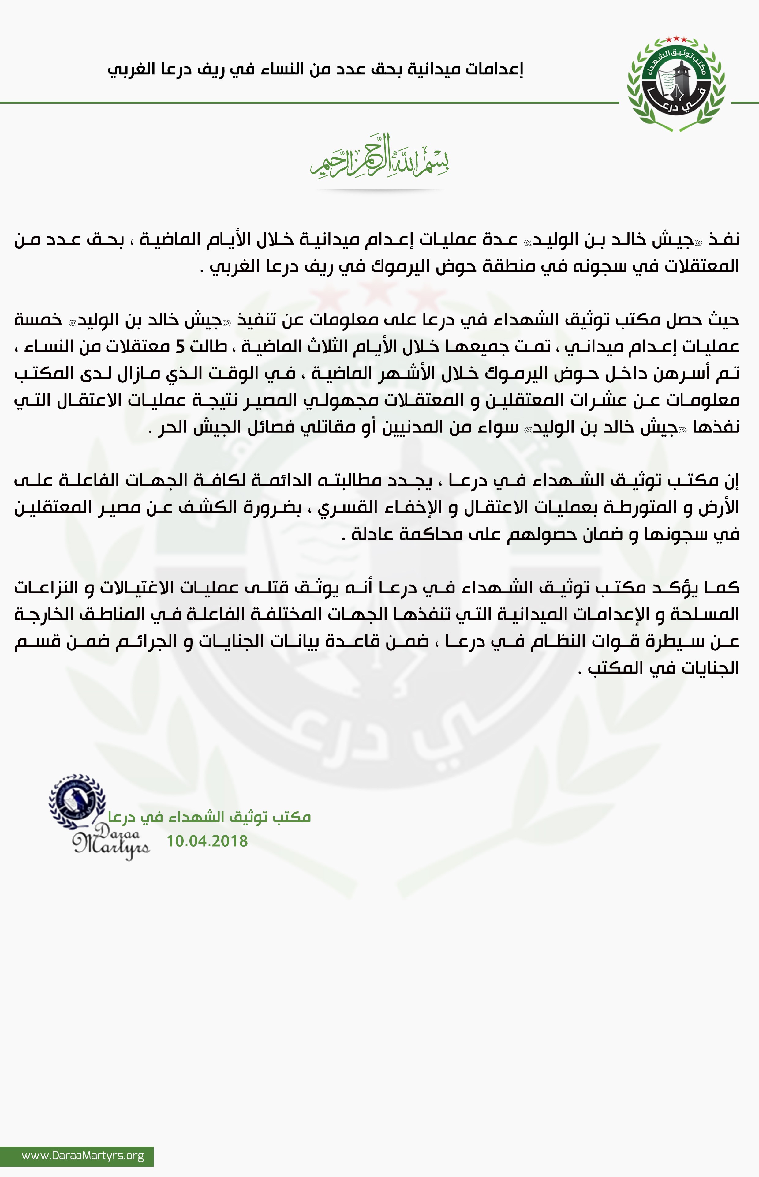 حيث حصل مكتب توثيق الشهداء في درعا على معلومات عن تنفيذ “جيش خالد بن الوليد” خمسة عمليات إعدام ميداني ، تمت جميعها خلال الأيام الثلاث الماضية ، طالت 5 معتقلات من النساء ، تم أسرهن داخل حوض اليرموك خلال الأشهر الماضية ، في الوقت الذي مازال لدى المكتب معلومات عن عشرات المعتقلين و المعتقلات مجهولي المصير نتيجة عمليات الاعتقال التي نفذها “جيش خالد بن الوليد” سواء من المدنيين أو مقاتلي فصائل الجيش الحر .