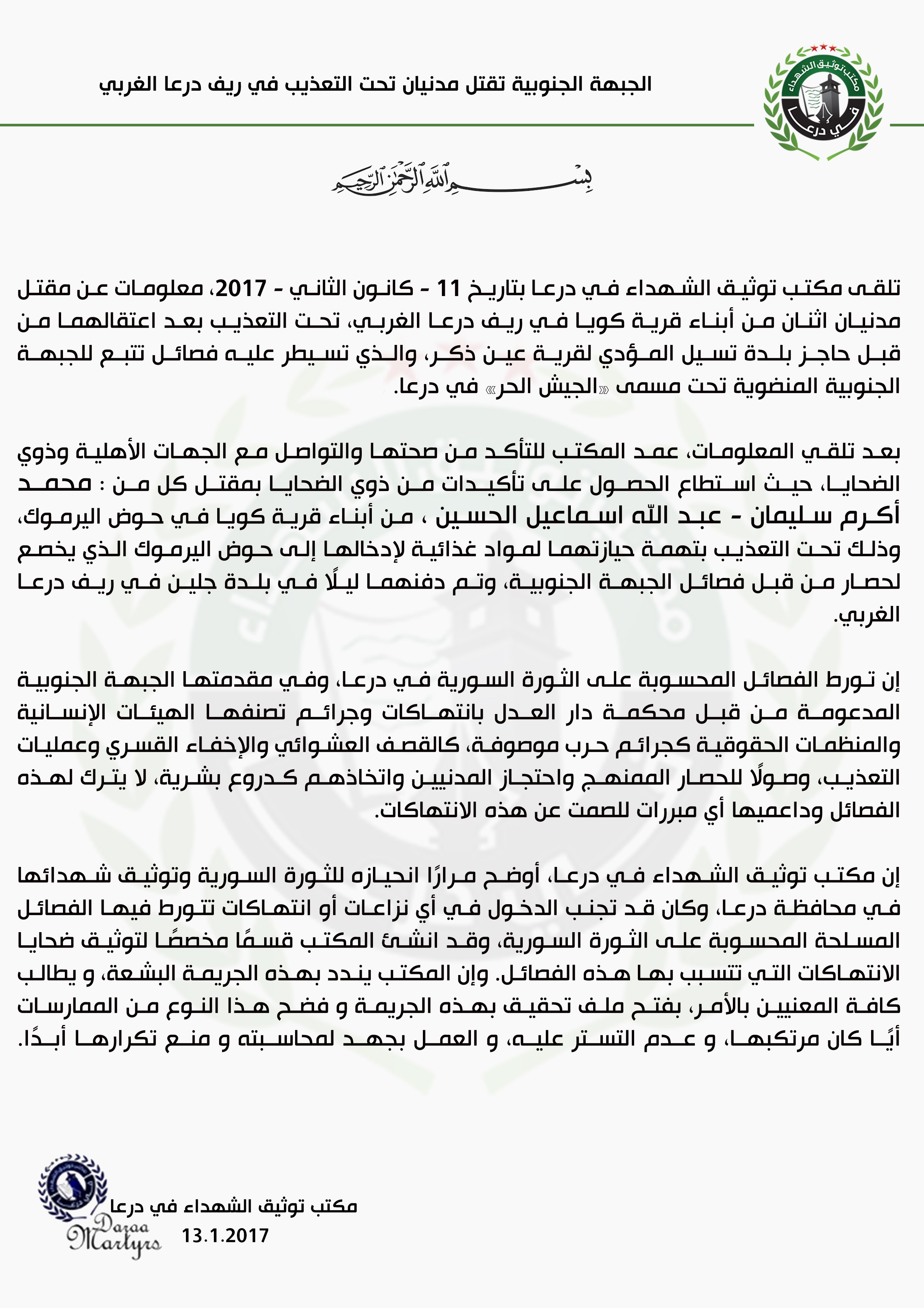 إن مكتب توثيق الشهداء في درعا، أوضح مرارًا انحيازه للثورة السورية وتوثيق شهدائها في محافظة درعا، وكان قد تجنب الدخول في أي نزاعات أو انتهاكات تتورط فيها الفصائل المسلحة المحسوبة على الثورة السورية، وقد انشئ المكتب قسمًا مخصصًا لتوثيق ضحايا الانتهاكات التي تتسبب بها هذه الفصائل. وإن المكتب يندد بهذه الجريمة البشعة، و يطالب كافة المعنيين بالأمر، بفتح ملف تحقيق بهذه الجريمة و فضح هذا النوع من الممارسات أيًا كان مرتكبها، و عدم التستر عليه، و العمل بجهد لمحاسبته و منع تكرارها أبدًا .