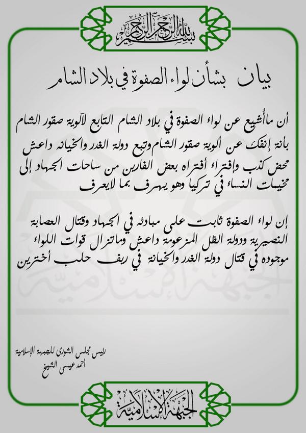 نفي مبايعة لواء الصفوة في بلاد الشام لتنظيم الدولة الإسلامية