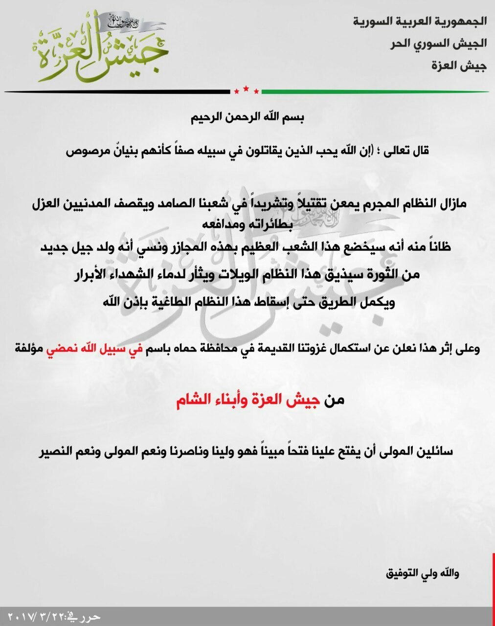الجيش الحر يطلق معركة في سبيل الله نمضي بريف حماة