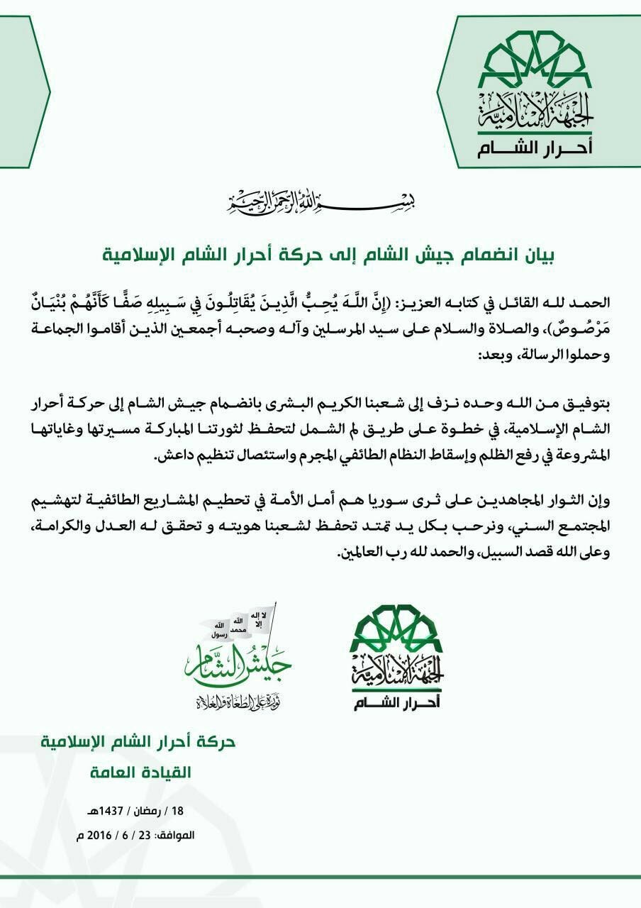بيان انضمام جيش الشام ينضم إلى حركة أحرار الشام الإسلامية