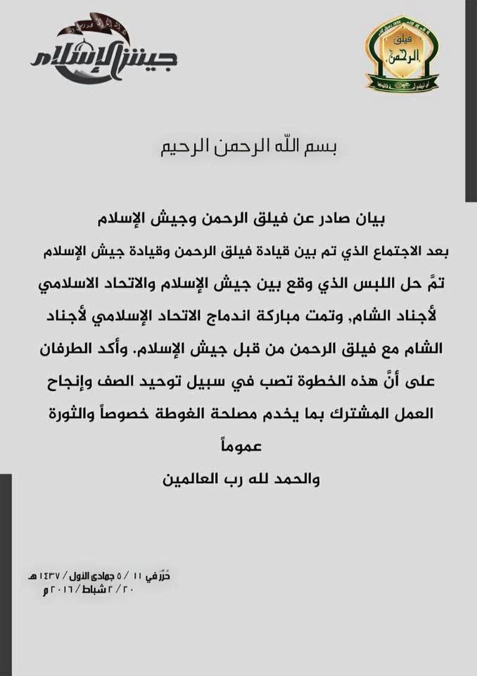بيان مشترك لجيش الإسلام وفيلق الرحمن حول اندماج الاتحاد الإسلامي ضمن فيلق الرحمن