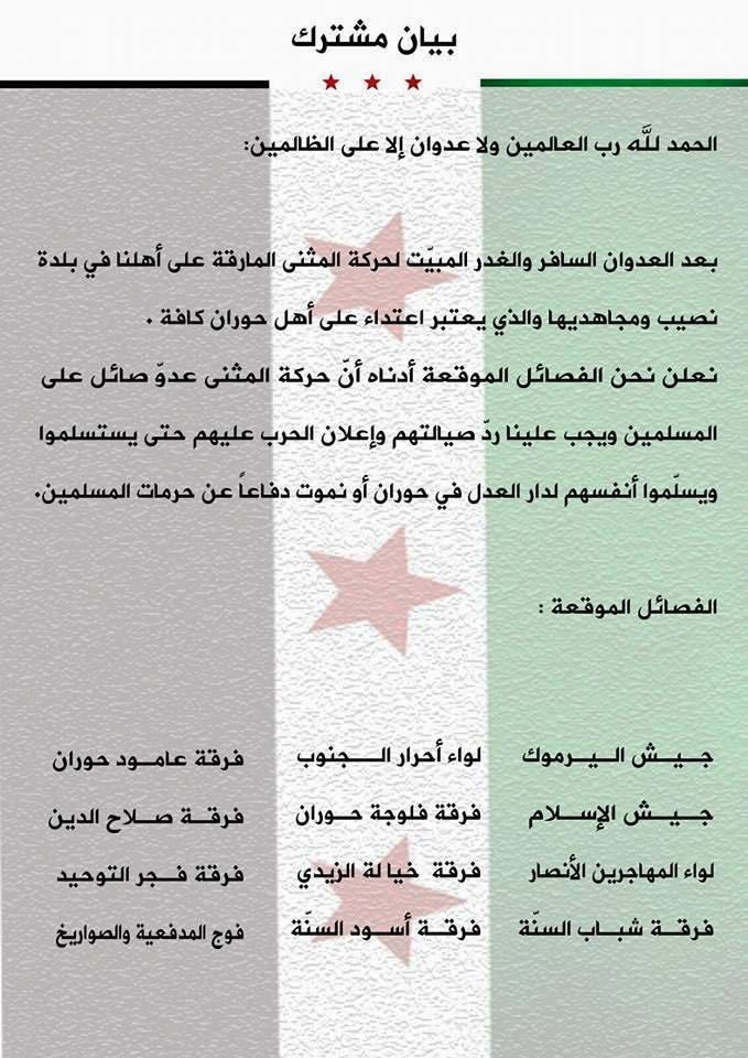 فصائل من الجيش الحر تعتبر “حركة المثنى” عدوا