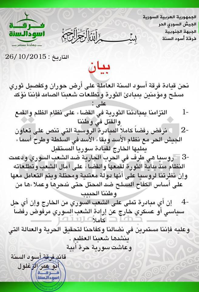 بيان رفض المبادرة الروسية من فرقة أسود السنة رفضاً قاطعاً