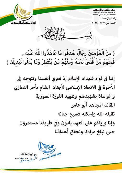 لواء شهداء الاسلام في الجيش الحر ينعي القائد العسكري العام للاتحاد الاسلامي لأجناد الشام
