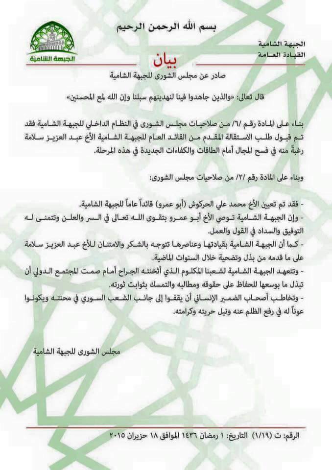 بيان صادر عن مجلس الشورى للجبهة الشامية حول قيادتها