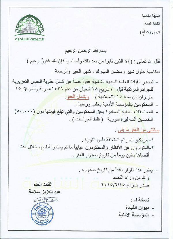 بيان عفو صادر عن القيادة العامة للجبهة الشامية بمناسبة حلول شهر رمضان