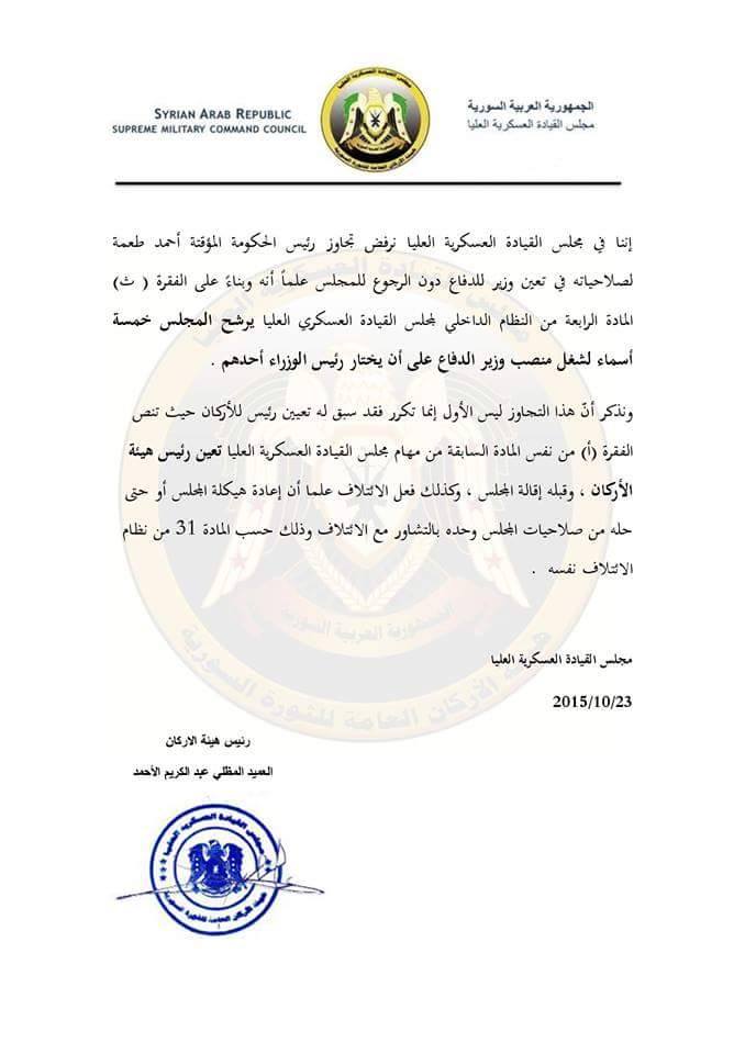 بيان رفض من مجلس القيادة العسكرية العليا لقرارات رئيس الحكومة المؤقتة أحمد طعمة