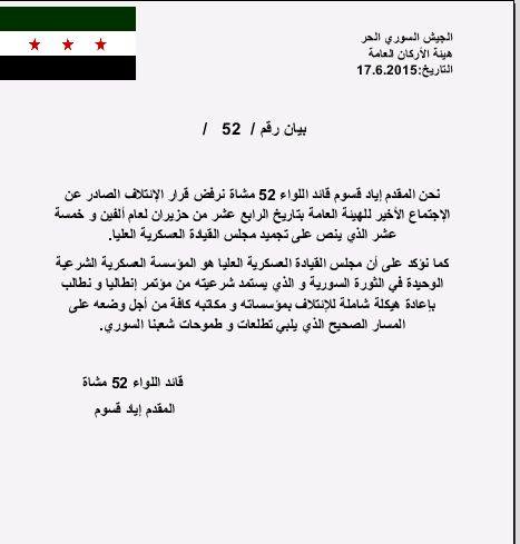 قرار بتأييد مجلس القيادة العسكرية العليا من قبل قيادة اللواء 52 مشاة ورفض بيان الائتلاف