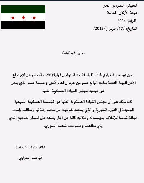 قرار بتأييد مجلس القيادة العسكرية العليا من قبل قيادة اللواء 51 ورفض بيان الائتلاف
