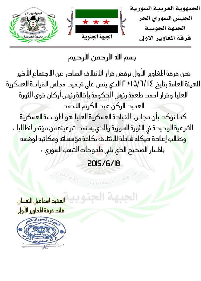قرار بتأييد مجلس القيادة العسكرية العليا من قبل قيادة فرقة المغاوير الاولى ورفض بيان الائتلاف
