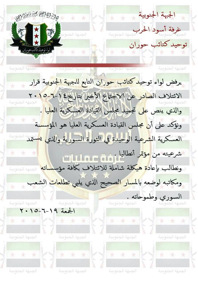 قرار بتأييد مجلس القيادة العسكرية العليا من قبل قيادة لواء توحيد كتائب حوران ورفض بيان الائتلاف
