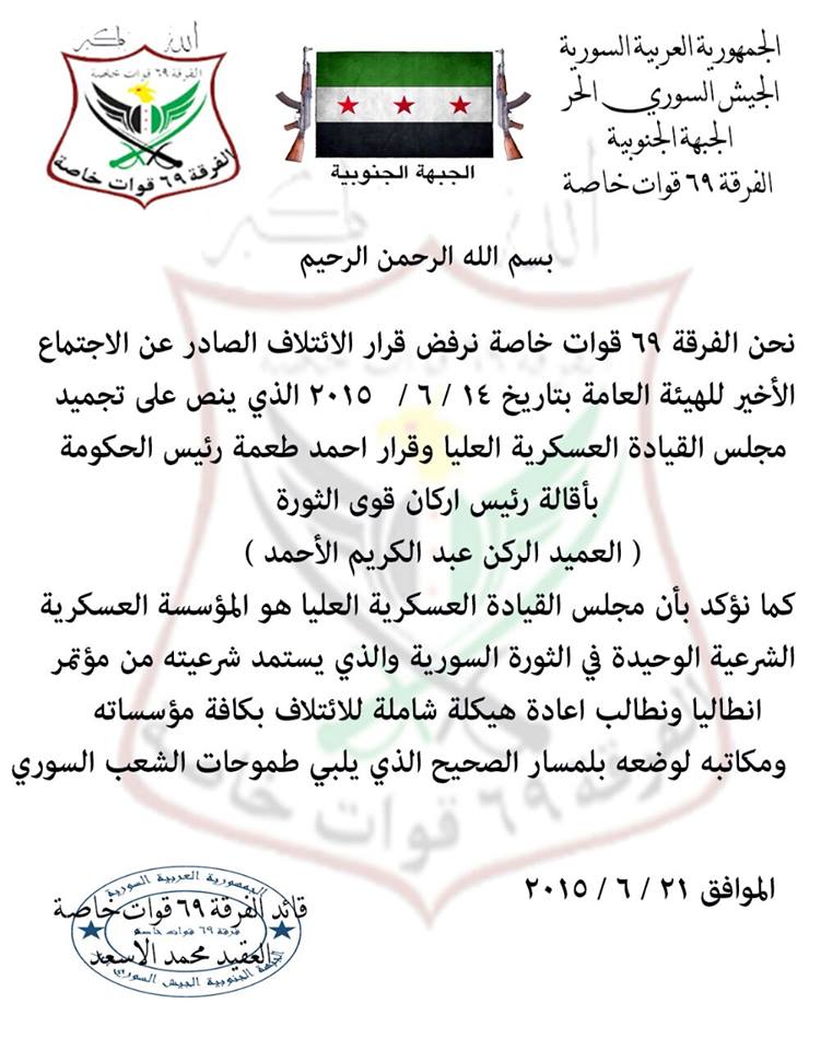 قرار بتأييد مجلس القيادة العسكرية العليا من قبل قيادة الفرقة 69 قوات خاصة ورفض بيان الائتلاف