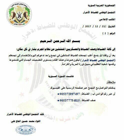 التجمع الوطني للضباط الأحرار يدعو كافة الضباط وصف الضباط والعسكريين المنشقين عن النظام للإنضمام إليه