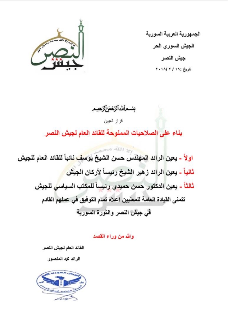 بيان من جيش النصر بتعين نائب القائد العام ورئيس الأركان ورئيس المكتب السياسي