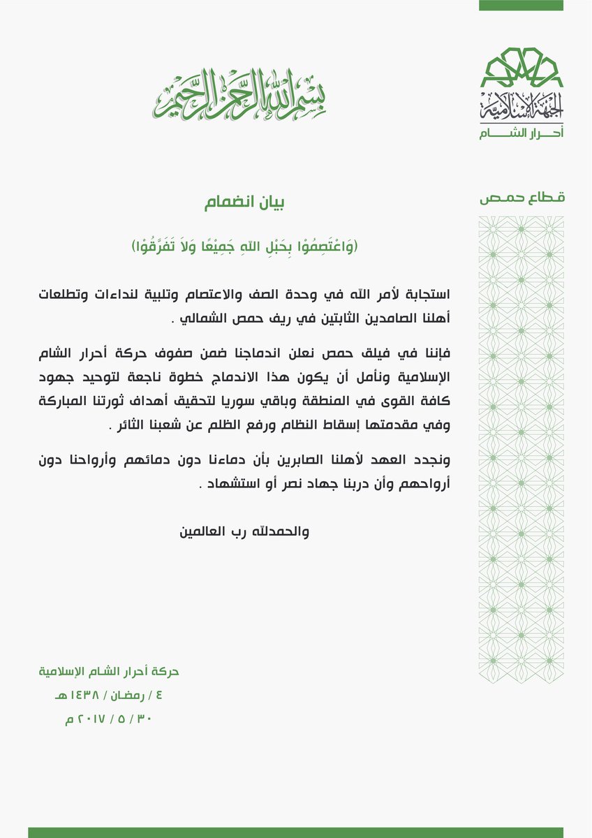 بيان انضمام فيلق حمص ضمن صفوف حركة أحرارالشام الإسلامية