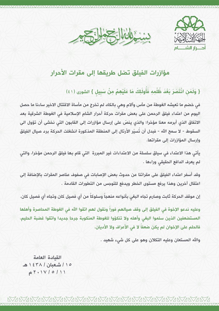 بيان إدانة من حركة أحرار الشام الإسلامية بعنوان: مؤازرات فيلق الرحمن تضل طريقها إلى مقرات أحرار الشام في الغوطة الشرقية