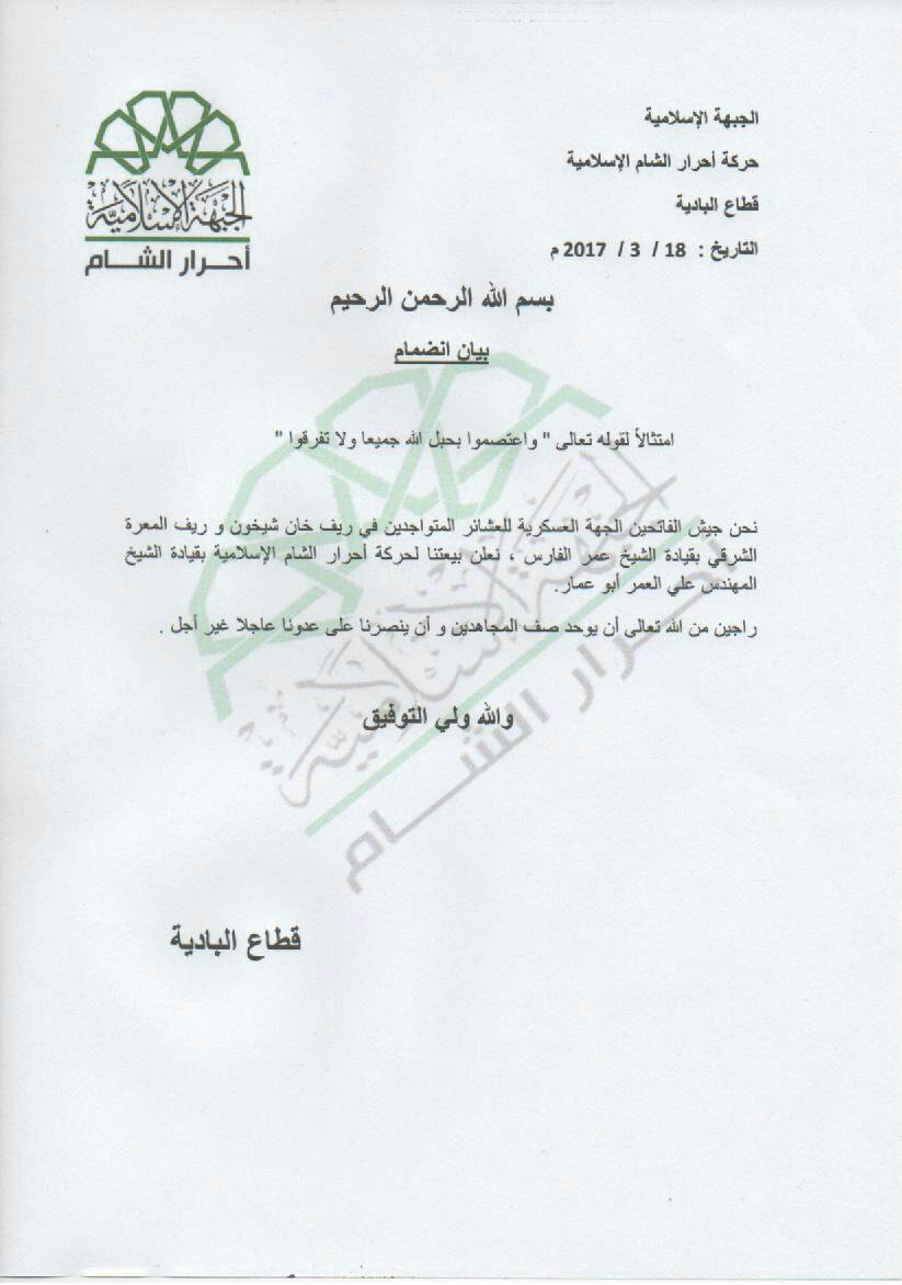 بيان انضمام جيش الفاتحين الجهة العسكرية للعشائر المتواجدين في ريف خان شيخون وريف المعرة الشرقي إلى حركة أحرار الشام الإسلامية