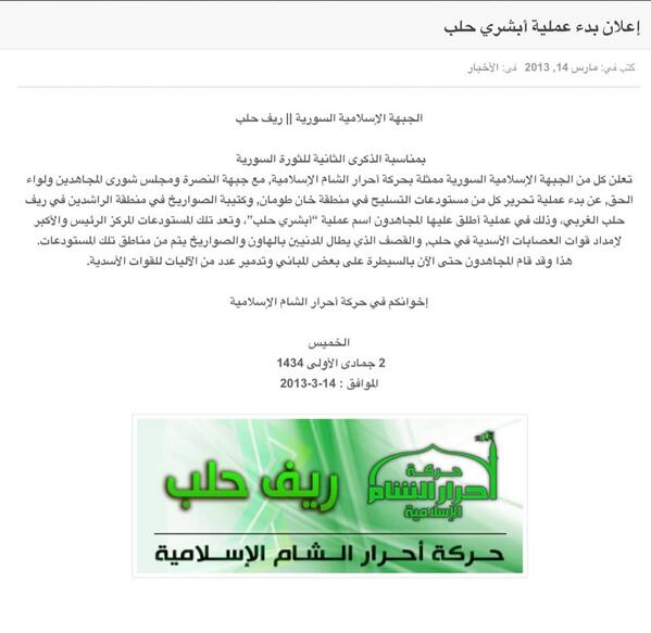 بيان أحرار الشام وجبهة النصرة ومجلس شورى المجاهدين ولواء الحق حول السيطرة على المستودعات في خان طومان