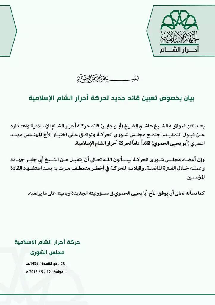 بيان بخصوص تعيين مهند المصري قائداً جديداً لحركة أحرار الشام الإسلامية