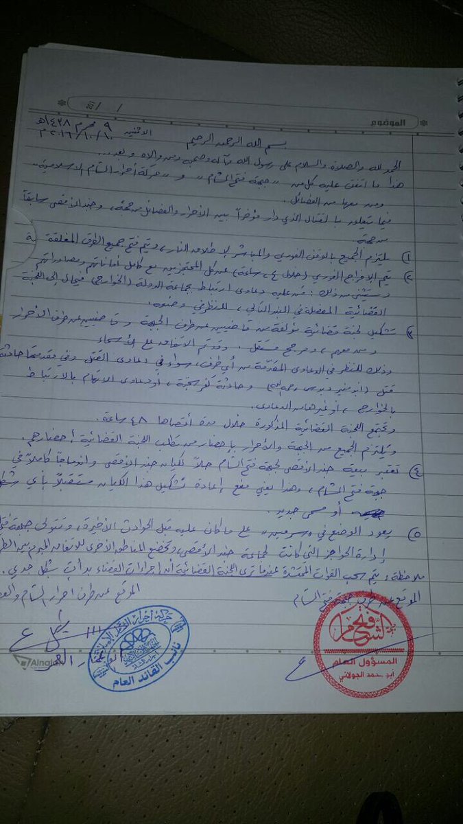نص اتفاق فتح الشام مع الأحرار بتوقيع ابو محمد الجولاني والدكتور علي العمر ابو عمار نائب القائد العام لحركة أحرار الشام