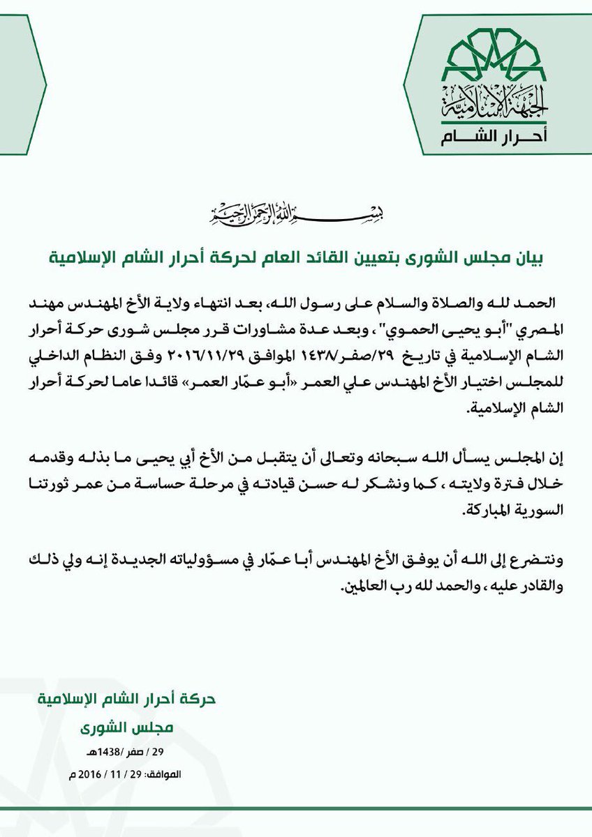 بيان مجلس الشورى بتعيين عمار العمر قائداً عاماً لحركة أحرار الشام الإسلامية