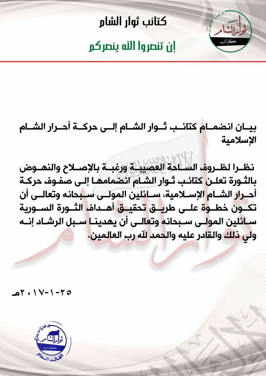بيان انضمام ثوار الشام لحركة أحرار الشام الإسلامية