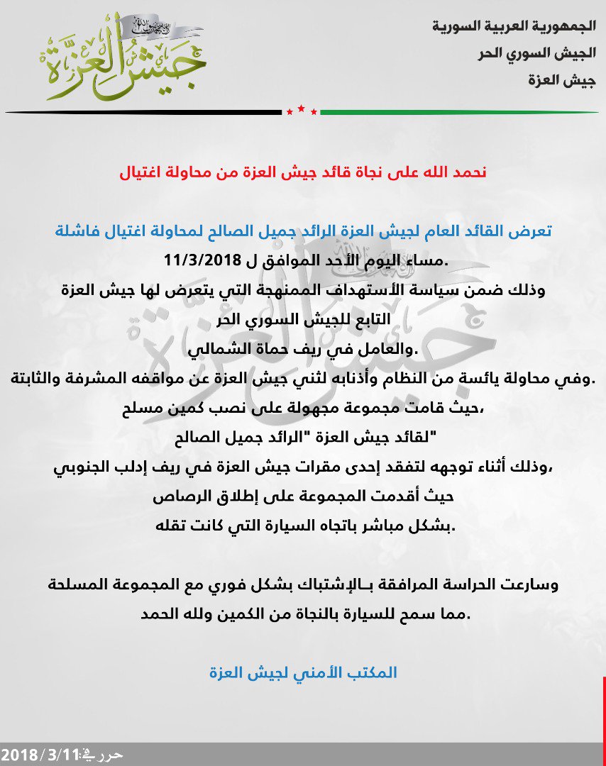 جيش العزة يعلن نجاة قائده الرائد جميل الصالح من محاولة اغتيال فاشلة