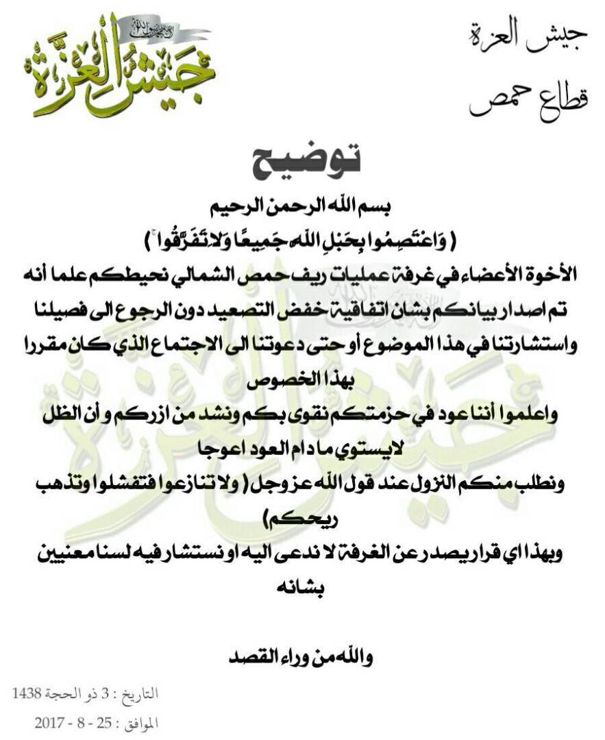 بيان جيش العزة قطاع حمص حول عدم الاعتراف بأي قرار يصدر عن غرفة عمليات حمص دون التشاور معه