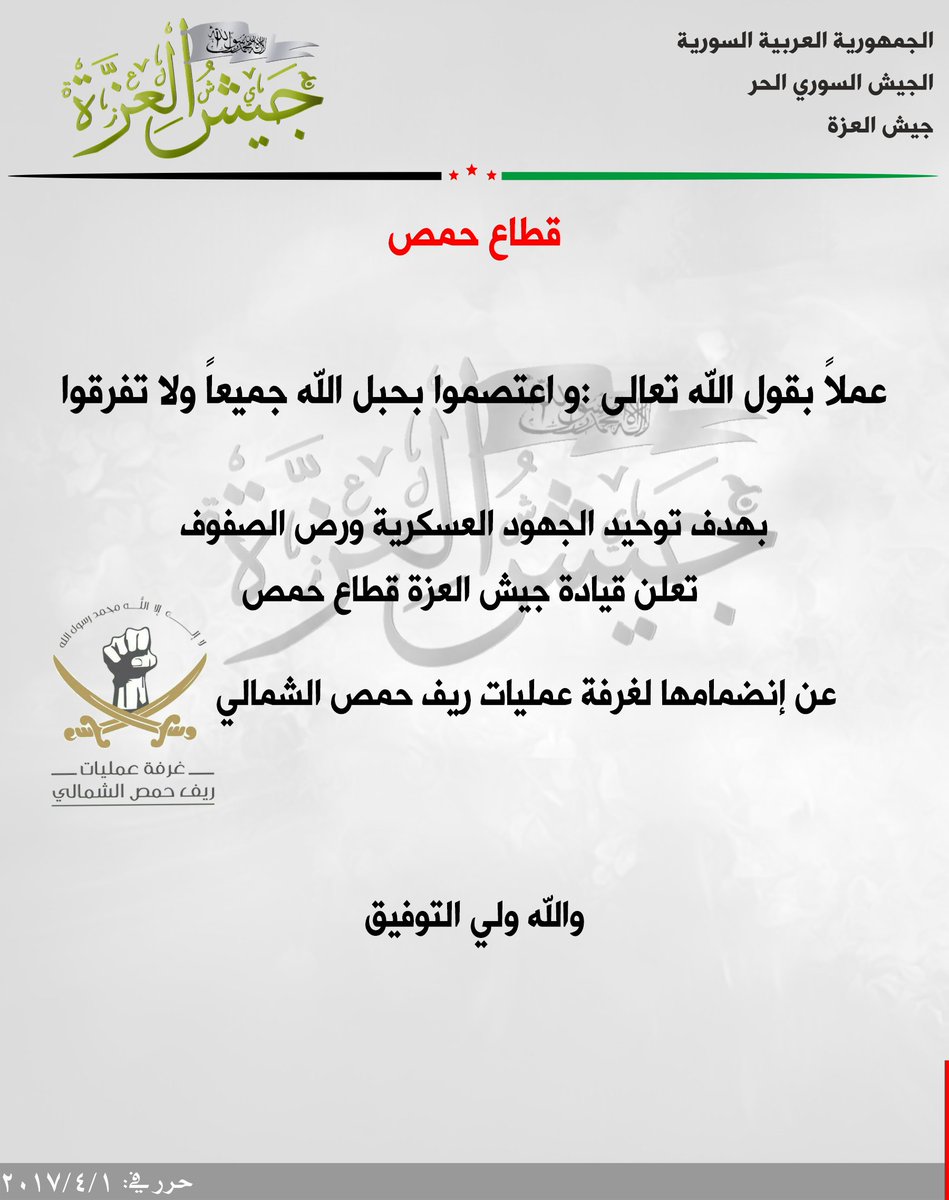 جيش العزة قطاع حمص يعلن انضمامه لغرفة عمليات ريف حمص الشمالي