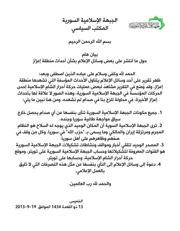 الجبهة الإسلامية السورية تنفي ضلوعها في أحداث منطقة اعزاز