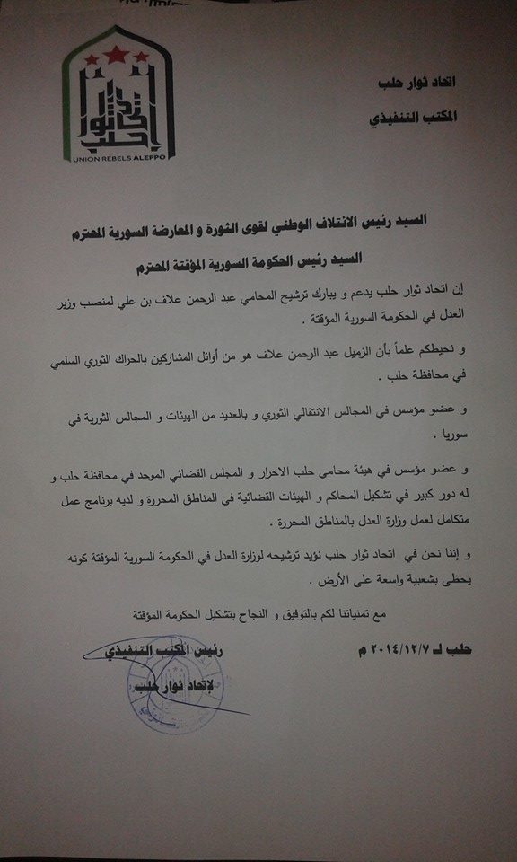 اتحاد ثوار حلب يدعم ترشيح الاستاذ عبد الرحمن علاف لوزارة العدل في الحكومة السورية المؤقتة