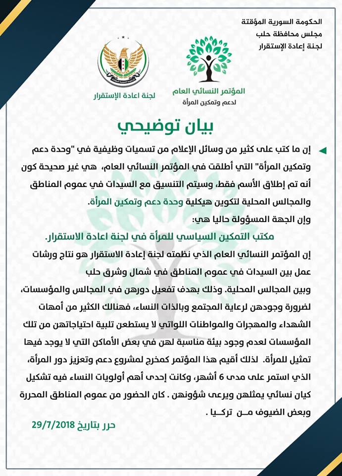 بيان توضيح للجهات الإعلامية والمعنية بخصوص المؤتمر النسائي العام لدعم وتمكين المرأة الذي أقامته لجنة إعادة الاستقرار