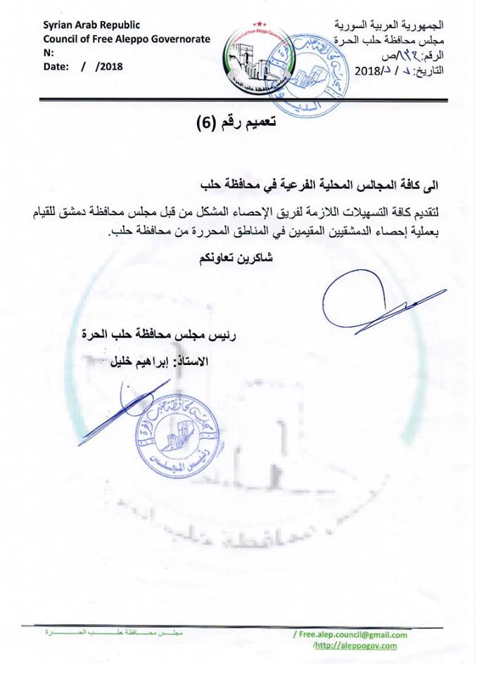 مجلس محافظة حلب الحرة يطلب من المجالس المحلية الفرعية تقديم كافة التسهيلات لفريق الإحصاء المشكل من قبل محافظة ريف دمشق