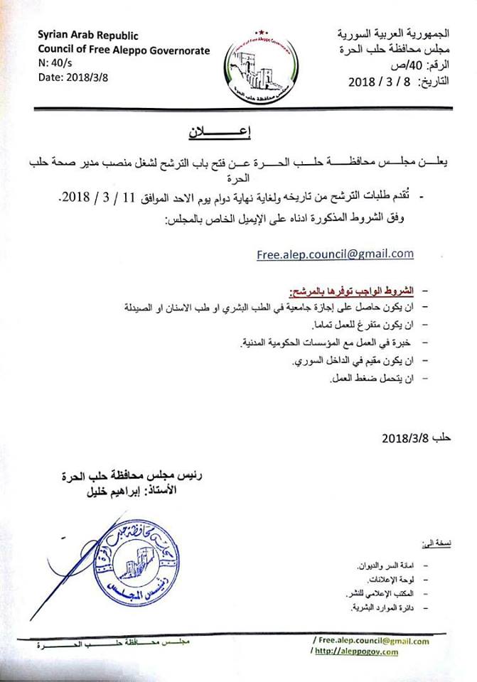 إعلان صادر عن مجلس محافظة حلب الحرة بخصوص فتح باب الترشح لشغل منصب مدير صحة حلب الحرة