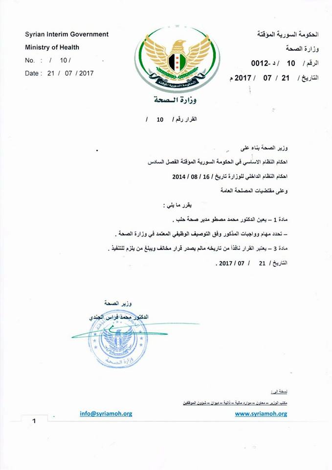 قرار من وزارة الصحة في الحكومة السورية المؤقتة بتعيين الدكتور محمد مصطو مدير صحة حلب الحرة