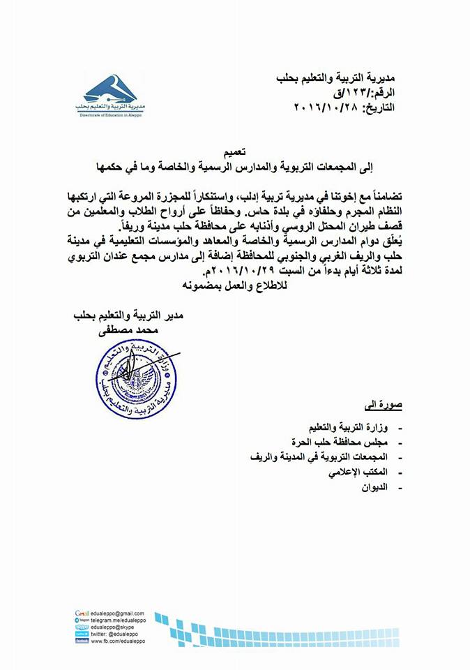 تعميم صادر عن مديرية التربية بحلب بخصوص قصف الطيران الروسي للمدارس وخاصة مدرسة حاس في ريف ادلب الجنوبي