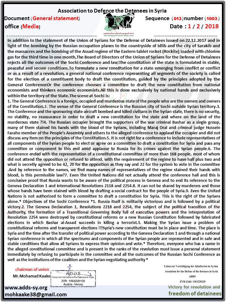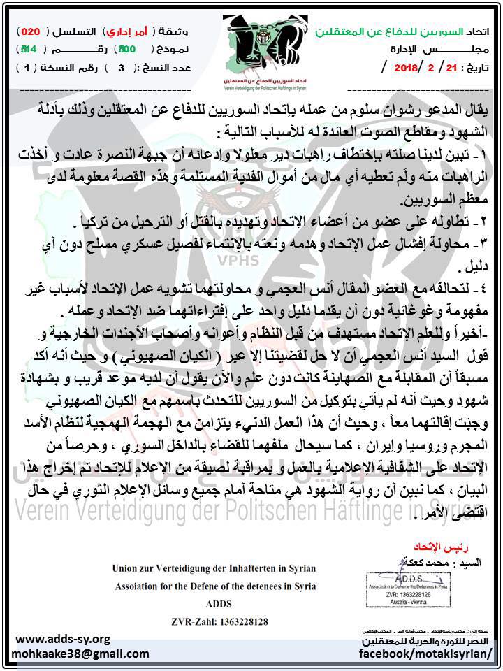 بيان اتحاد السوريين للدفاع عن المعتقلين حول إقالة المدعو رشوان سلوم من الاتحاد
