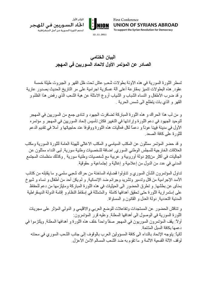 البيان الختامي الصادر عن المؤتمر الأول لإتحاد السوريين في المهجر