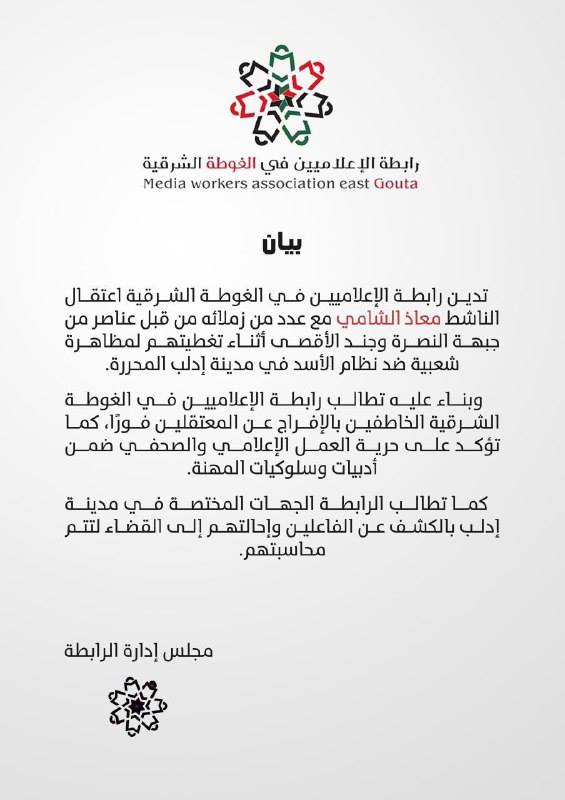 رابطة الإعلاميين في الغوطة الشرقية تدين إعتقال الناشط معاذ الشامي إبن غوطة دمشق الشرقية الذي سافر من الغوطة للشمال السوري لتغطية معارك الجيش الحر وتم إعتقاله آثناء تغطيته مظاهرة ضد النظام الأسدي