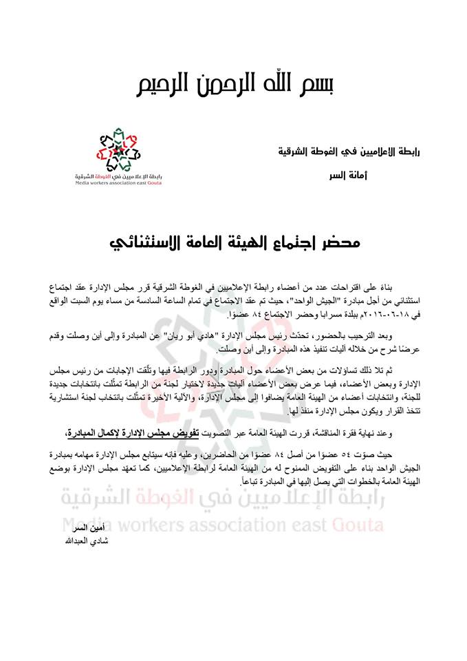 بيان من رابطة الإعلاميين للغوطة الشرقية بخصوص محضر اجتماع الهيئة العامة الاستثنائي بخصوص مبادرة الجيش الواحد