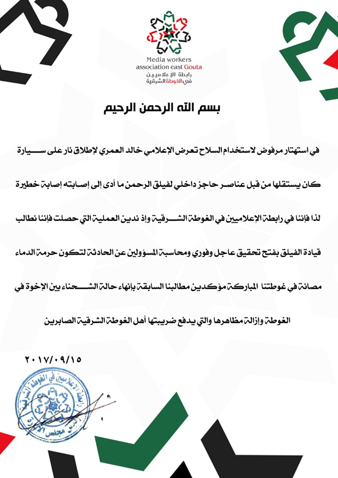 رابطة الإعلاميين للغوطة الشرقية تدين تعرض الإعلامي خالد العمري لإصابة خطيرة جراء إطلاق عناصر حاجز تابع لفيلق الرحمن في الغوطة وتطالب الفيلق بمحاسبة المسؤولين