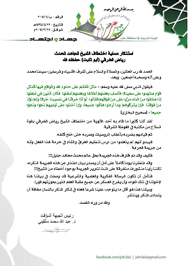 ب6/ 2014بتاريخ: 22/ 5/ 1435هـالموافق: 24/ 3/ 2014مالحمد لله رب العالمين، والصلاة والسلام على أشرف الأنبياء والمرسلين؛ سيدنا محمد وعلى آله وصحبه أجمعين. وبعد:فيقول النبي صلى الله عليه وسلم: ” مَثَلُ الْقَائِمِ عَلَى حُدُودِ اللهِ وَالْوَاقِعِ فِيهَا كَمَثَلِ قَوْمٍ اسْتَهَمُوا عَلَى سَفِينَةٍ؛ فَأَصَابَ بَعْضُهُمْ أَعْلاهَا وَبَعْضُهُمْ أَسْفَلَهَا. فَكَانَ الَّذِينَ فِي أَسْفَلِهَا إِذَا اسْتَقَوْا مِنْ الْمَاءِ مَرُّوا عَلَى مَنْ فَوْقَهُمْ فَقَالُوا: لَوْ أَنَّا خَرَقْنَا فِي نَصِيبِنَا خَرْقاً وَلَمْ نُؤْذِ مَنْ فَوْقَنَا. فَإِنْ يَتْرُكُوهُمْ وَمَا أَرَادُوا هَلَكُوا جَمِيعاً، وَإِنْ أَخَذُوا عَلَى أَيْدِيهِمْ نَجَوْا وَنَجَوْا جَمِيعاً “ [صحيح البخاري].لقد آلمنا كثيراً ما قام به أحد الألوية من اختطاف الشيخ رياض الخرقي بقوة السلاح من مكتبه في الغوطة الشرقية.ثم قيامهم بضربه بأعقاب الروسيات وضربه حتى خلع كتفه.فيبدو أنهم لم يتعلموا من درس تنظيم العراق والشام في حرمة هذا الفعل وأنه من جريمة الحرابة.فكيف وقد تم اقتراف هذه الجريمة بحق عالم محدث مجاهد جليل!!!وقد انتظرنا يوماً كاملاً على أمل أن يصدر بيان اعتذار عن هذه الجريمة النكراء، لكننا رأينا منشورات متفرقة على النت لتبرير الجريمة بوجود أخطاء من الشيخ!!!فنأمل أن تكون الرسالة الفكرية والعلمية والشرعية قد وصلت في بياننا هذا لإخوتنا في ذلك اللواء، وأن يفرج العسكر عن جميع طلبة العلم الذين بحوزتهم فوراً.وبياننا هذا هو أقل ما يتوجب علينا شرعاً فعله في إنكار المنكر باللسان مخافة أن يتمادى المنكر وينتشر.والله من وراء القصد.رئيس جبهة علماء حلب المؤقتد. عبد الله محمد سلقيني