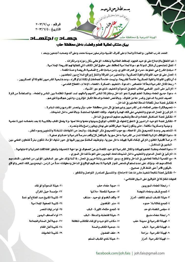 "بيان عنتاب لطلبة العلم والعلماء داخل محافظة حلب" حول شكل الدولة ومبادئ الحراك الثوري