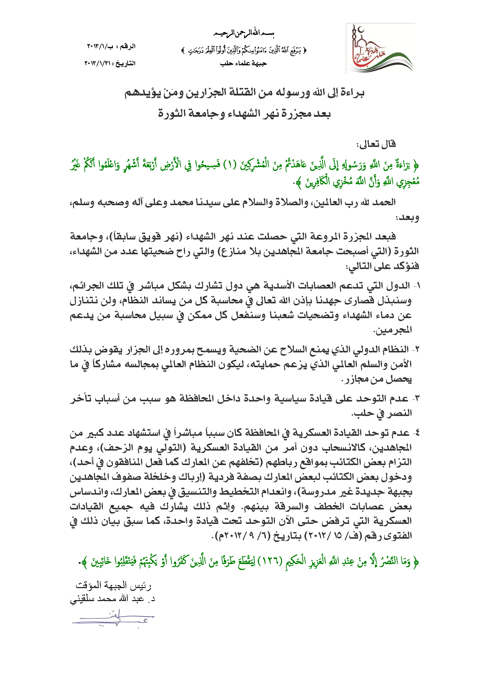 بيان من جبهة علماء حلب بخصوص مجزرة نهر قويق ومجزرة جامعة حلب