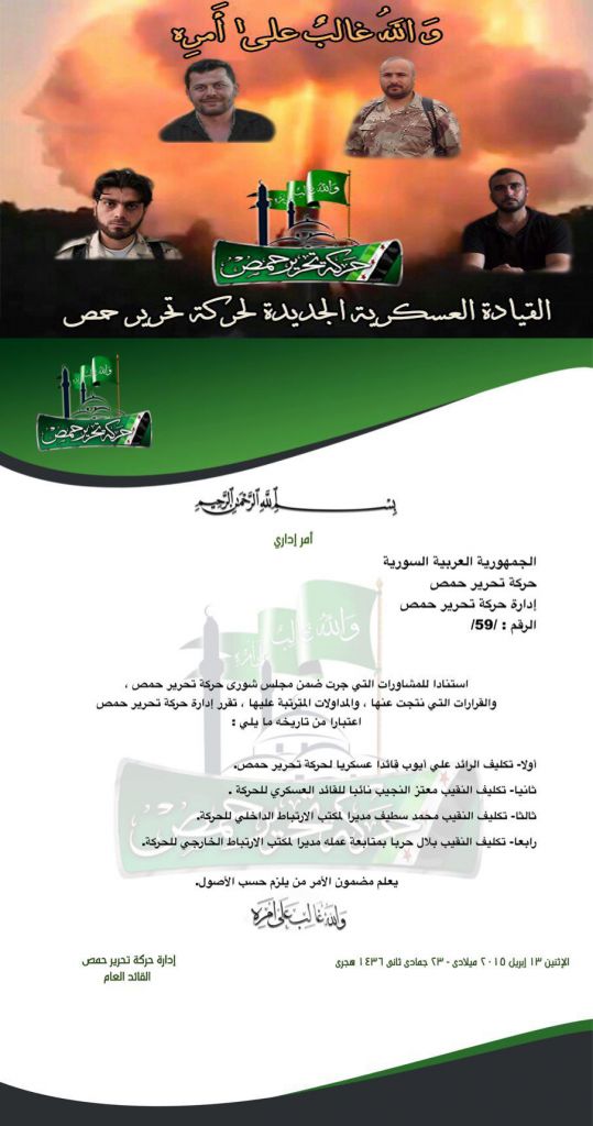 إدارة حركة تحرير حمص تصدر قراراً إدارياً بتعيين قائداً عسكرياً ونائباً له