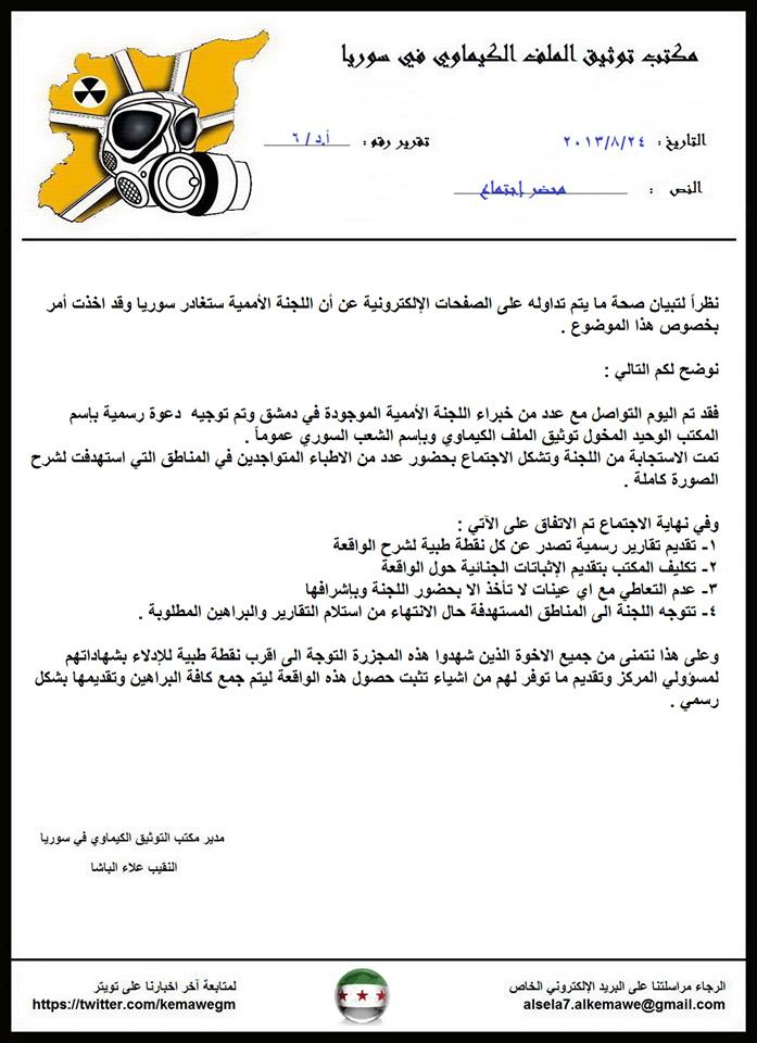 فقد تم اليوم التواصل مع عدد من خبراء اللجنة الأممية الموجودة في دمشق وتم توجيه دعوة رسمية بإسم المكتب الوحيد المخول توثيق الملف الكيماوي وبإسم الشعب السوري عموماً .